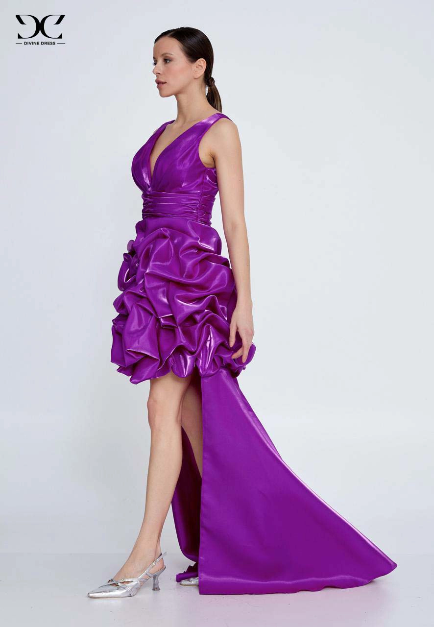 Robe de soirée violette asymétrique avec décolleté plongeant, jupe courte à effet floral et longue traîne élégante. Parfaite pour un look glamour lors de galas ou cérémonies.