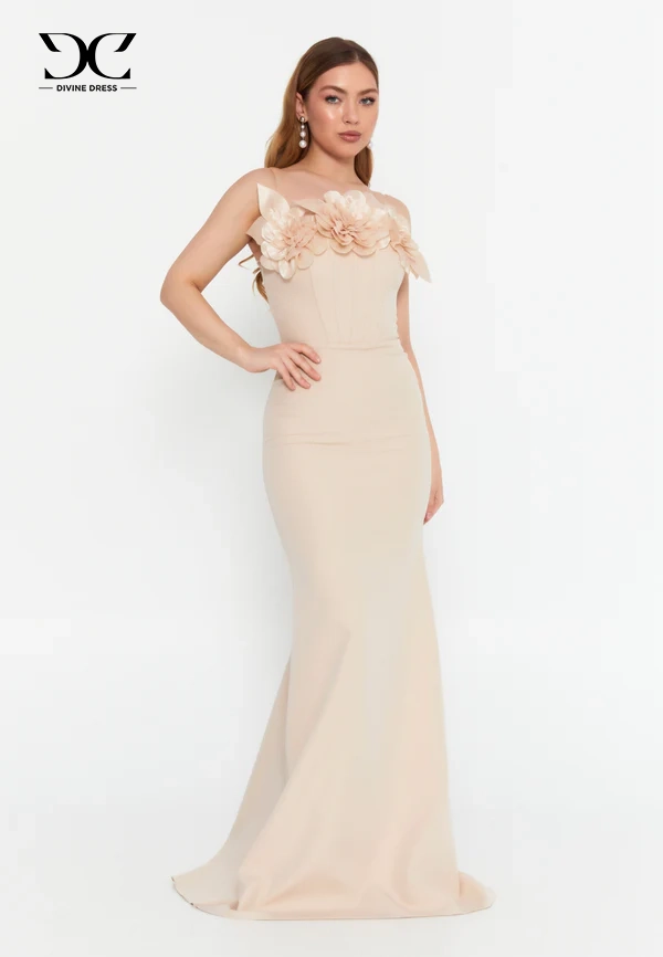 Élégante robe longue beige nude à coupe sirène, ornée de fleurs en relief sur le buste. Idéale pour les mariages, soirées et cérémonies. Tissu fluide, coupe féminine et épurée.