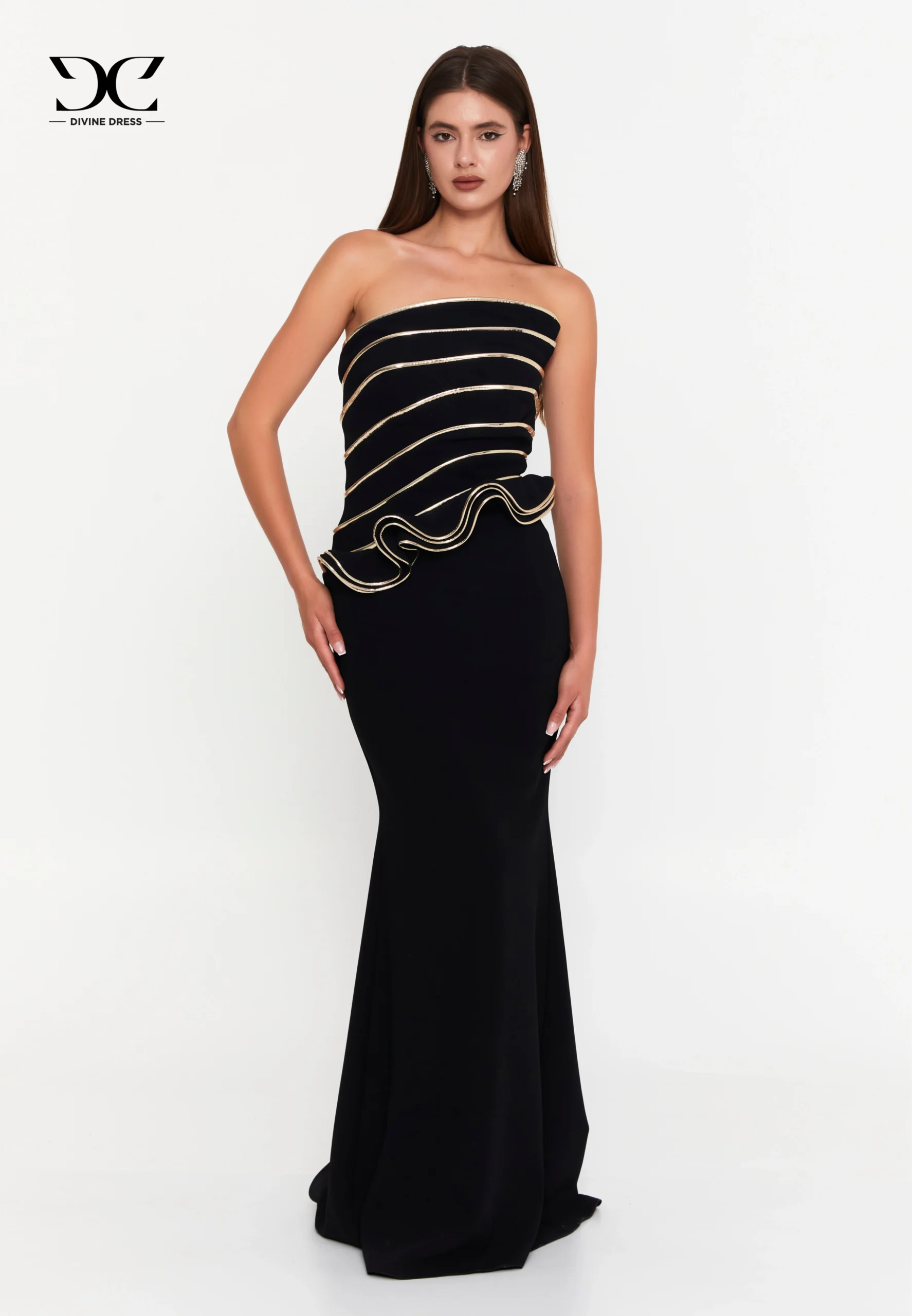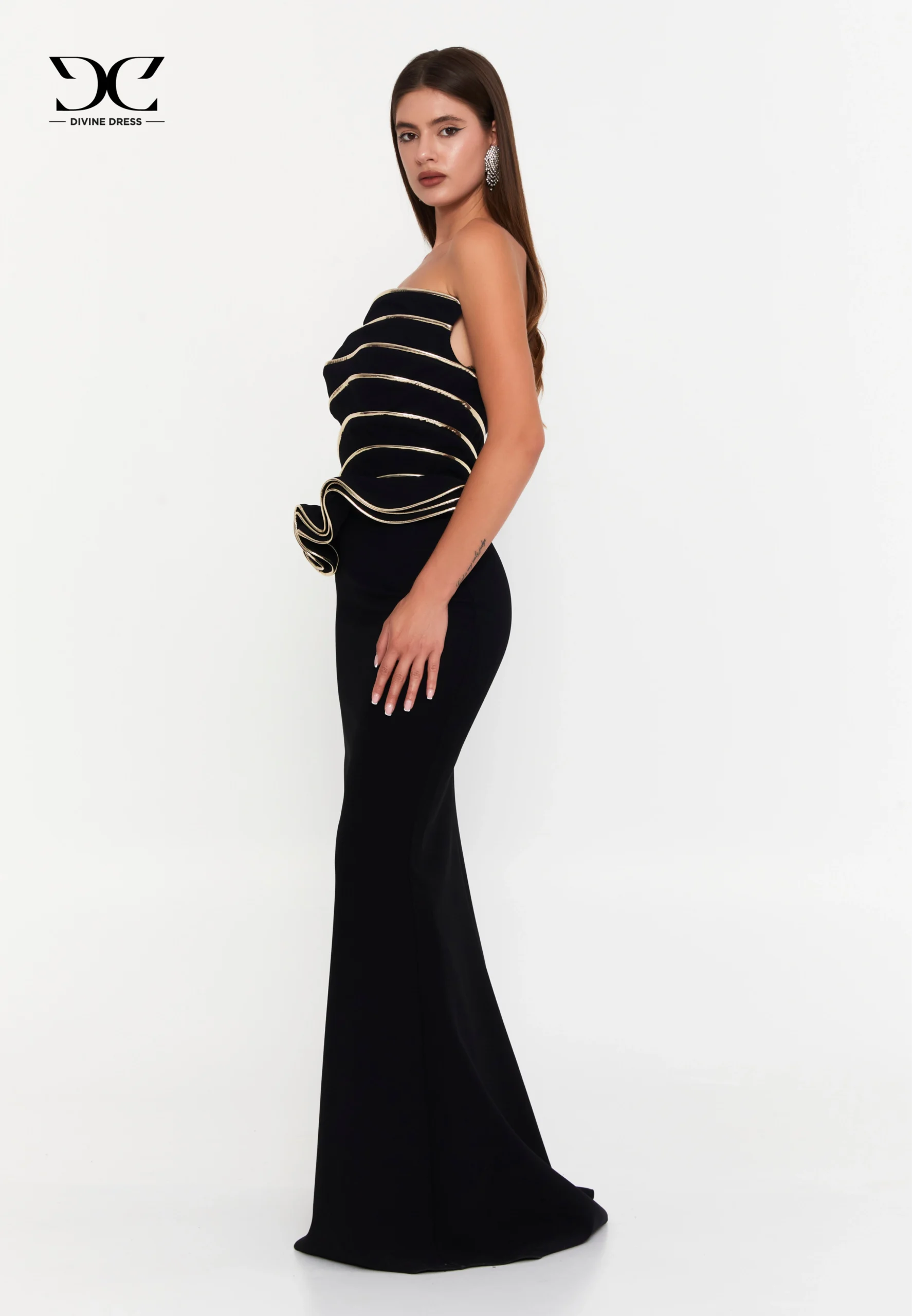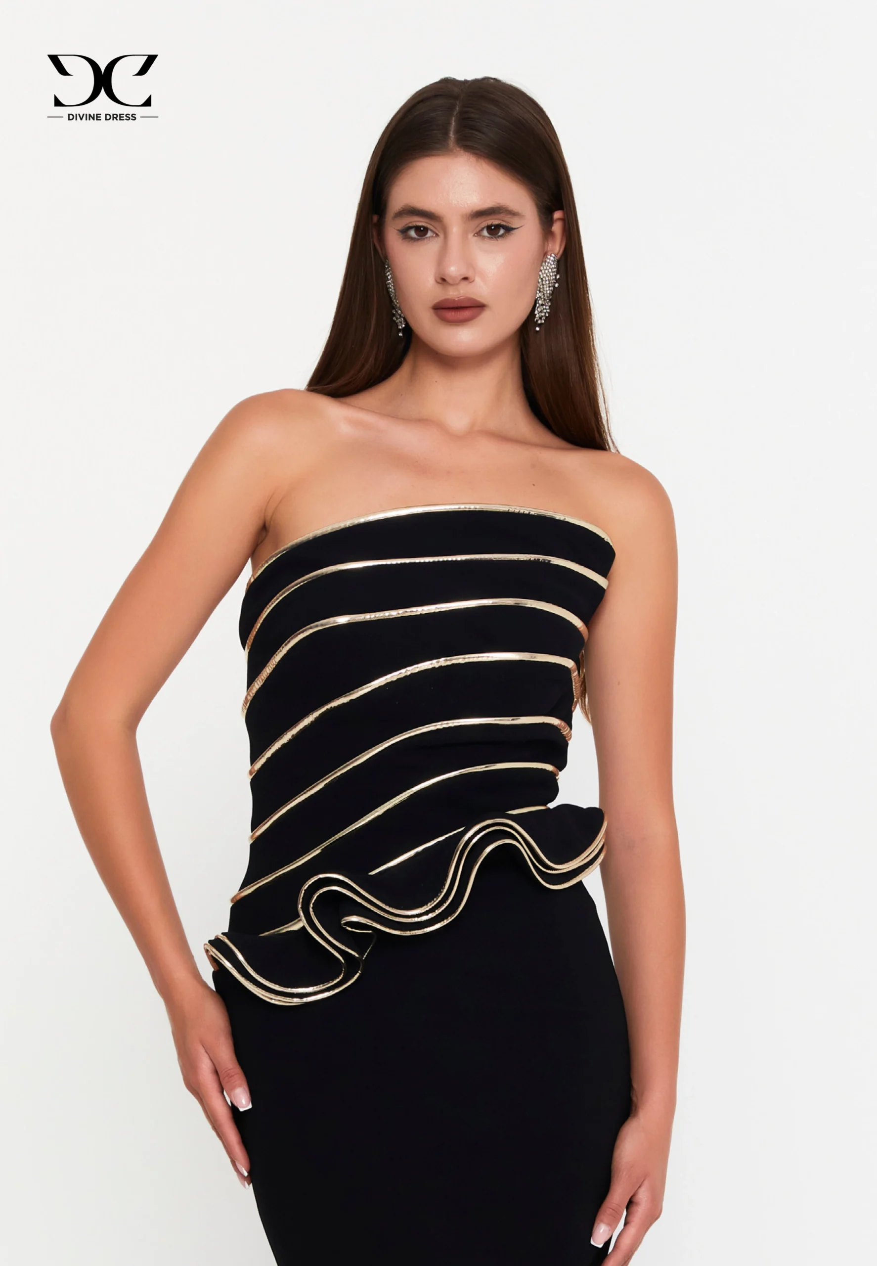 La robe soirée noire est conçue pour sublimer vos événements. Son tissu noir fluide et ses bretelles dorées créent un contraste raffiné. Elle valorise la silhouette tout en offrant un confort optimal lors de mariages, cocktails ou soirées.